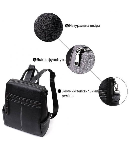 Місткий жіночий рюкзак з натуральної шкіри, прошитий білим рядком, що надає йому стилю та цікавого вигляду. Аксесуар складається з одного відділення, що закривається на блискавку всередині якого знаходиться дві кишені на блискавках, а зовні також дві кишені на блискавках і дві бічні кишені. Носити сумку можна на спині, в руках та через плече. В аксесуарі використано якісну фурнітуру кольору темного срібла.