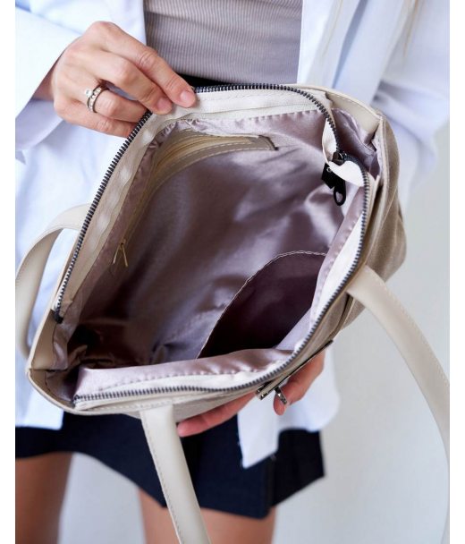 Сумка жіноча 15159 від виробника «Welassie» Україна, колір бежевий, матеріал екошкіра високої якості зі встакою з натуральної замші. Сумка відкривається за допомогою застібки-блискавки. Усередині сумка має вікритий карман та на застібці.