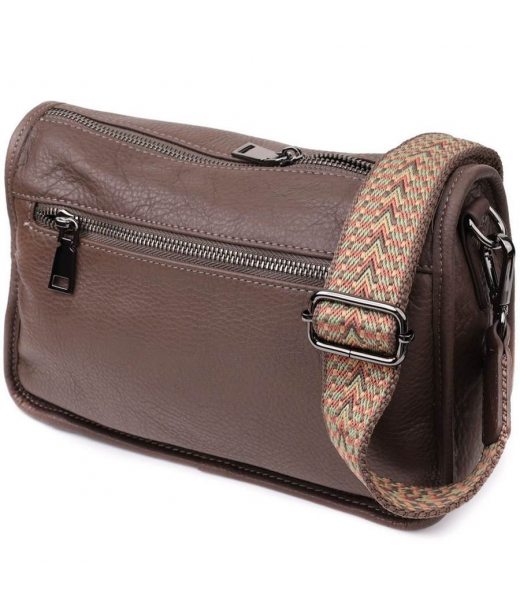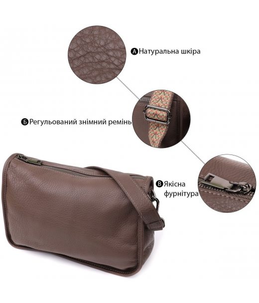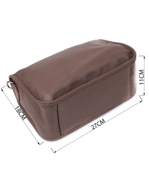 Фурнітура кольору срібла красиво контрастує із теплим тоном коричневої шкіри, додаючи аксесуару стриманого блиску. У комплект входять два знімні ремінці - шкіряний і текстильний, що дозволяє змінювати стиль і спосіб носіння сумки в залежності від настрою та випадку.