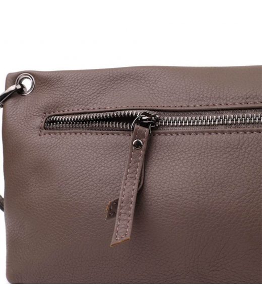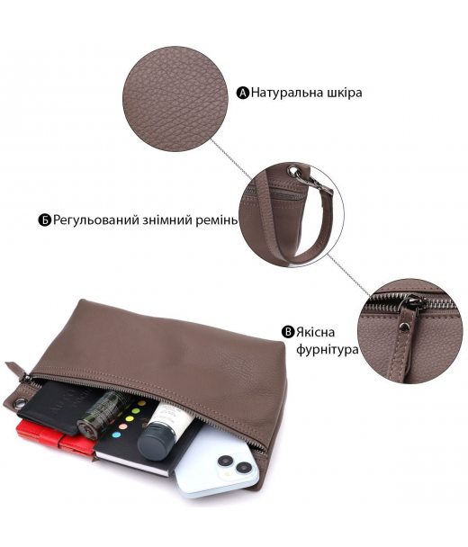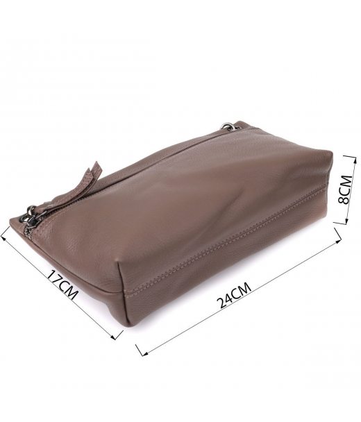 Фурнітура кольору срібла гармонійно поєднується з теплим відтінком шкіри, підкреслюючи витонченість аксесуара. Знімний шкіряний ремінець дозволяє носити клатч у руці або на плечі.