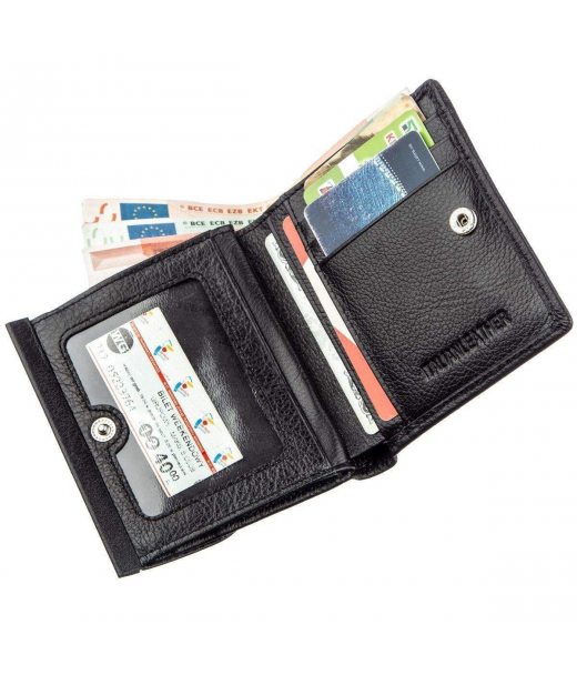 Невеликий практичний жіночий гаманець з натуральної шкіри високої якості. Має універсальний чорний колір з матовим відтінком. Якщо Ви не є шанувальником великих і громіздких гаманців, то дане портмоне прекрасний вибір. Усередині гаманця розташовано два основних відділення для купюр, відділення на блискавці для особливо цінних дрібниць, кишені для фото близьких людей і звичайно ж карток і візиток. Монетниця в даній моделі знаходиться на тильній стороні і має два відділення, закривається на металеву кнопку. Такий гаманець може стати чудовою обновкою не тільки для себе, але і відмінним подарунком для дорогої людини. Продається аксесуар в білій картонній коробці з фірмовим логотипом.