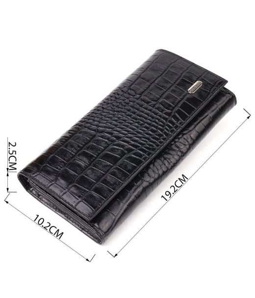 Практичний горизонтальний жіночий гаманець із фактурної натуральної шкіри, з тисненням під крокодила. Аксесуар має три великі кишені для купюр, три прилеглі кишені, вісім осередків для карток, три з них під сіточкою, монетницю на блискавці. Виріб закривається клапаном на кнопку. Відмінна ідея для подарунка, яка не залишить байдужою жодну жінку.